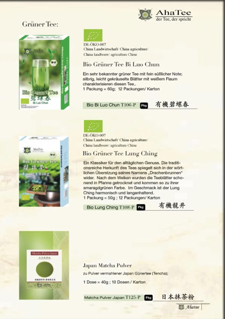 Über Jahrtausende hat sich die chinesische Teekultur geformt und verfeinert und eine Diversität von Teesorten hervorgebracht. Ob Grüner Tee, Oolong Tee, Weißer Tee, Pu Erh Tee, Jasmin Tee, Schwarzer Tee, Artisan Tee oder Matcha Pulver, unser Sortiment bietet eine Vielzahl von Tee Spezialitäten aus dem asiatischen Raum. Neben den klassischen Teeblättern präsentieren wir außerdem Teeblumen, sowie eine breite Auswahl von Teezubehör, feinen Teetischen und Geschirr für die Teezeremonie.