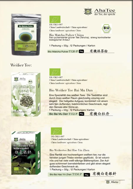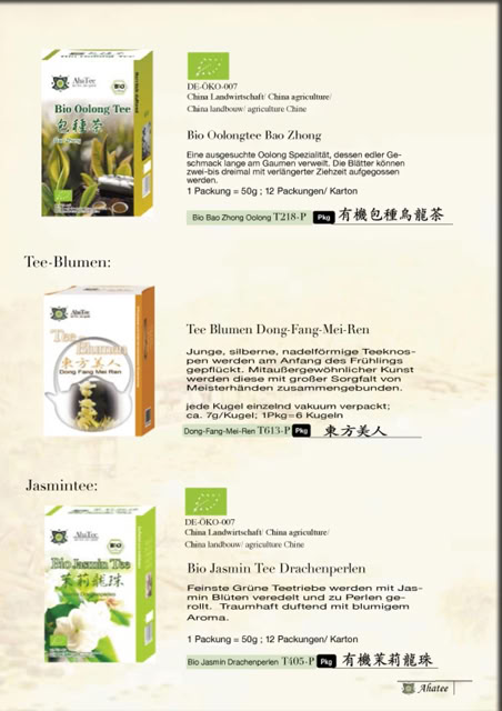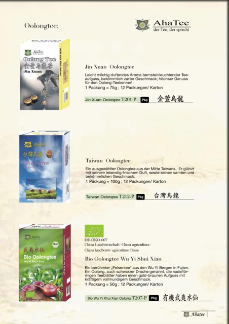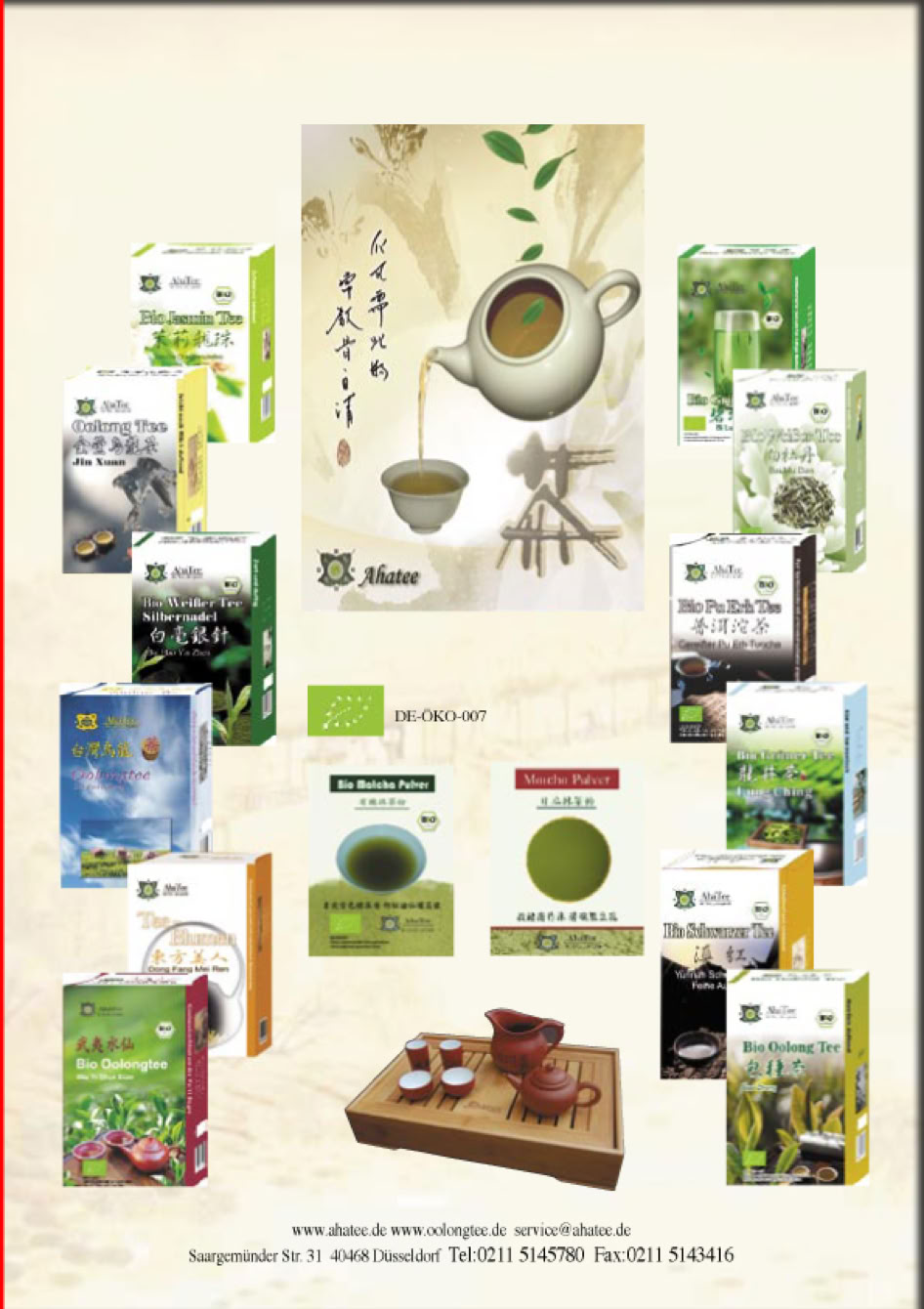 Über Jahrtausende hat sich die chinesische Teekultur geformt und verfeinert und eine Diversität von Teesorten hervorgebracht. Ob Grüner Tee, Oolong Tee, Weißer Tee, Pu Erh Tee, Jasmin Tee, Schwarzer Tee, Artisan Tee oder Matcha Pulver, unser Sortiment bietet eine Vielzahl von Tee Spezialitäten aus dem asiatischen Raum. Neben den klassischen Teeblättern präsentieren wir außerdem Teeblumen, sowie eine breite Auswahl von Teezubehör, feinen Teetischen und Geschirr für die Teezeremonie.